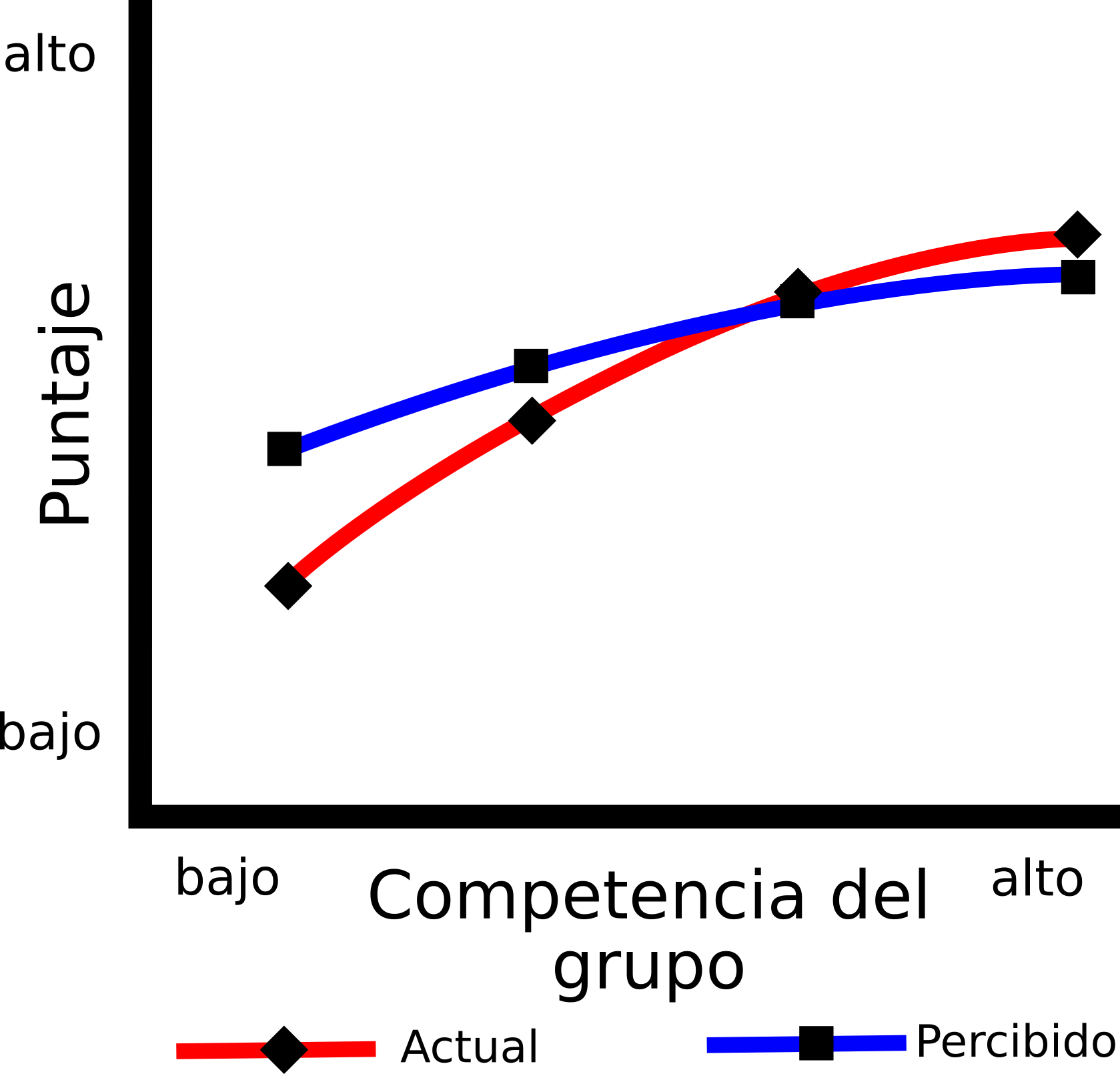 Relación entre el rendimiento promedio autopercibido y el rendimiento promedio real en un examen universitario.(*cita). Las personas de bajo rendimiento tienden a